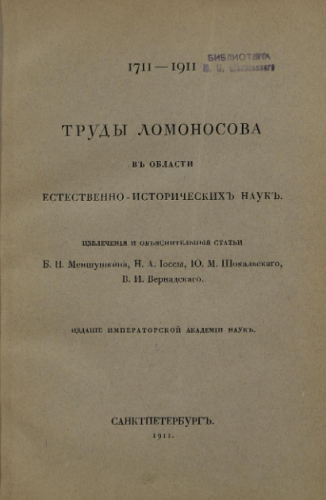 Труды Ломоносова в области естественно-исторических наук : извлеч. и объясн. ст. Б.Н. Меншуткина, Н.А. Иоссы, Ю.М. Шокальского, В.И. Вернадского / Изд-е Имп. Акад. наук. - Санктпетербург : Тип. Имп. Акад. наук, 1911