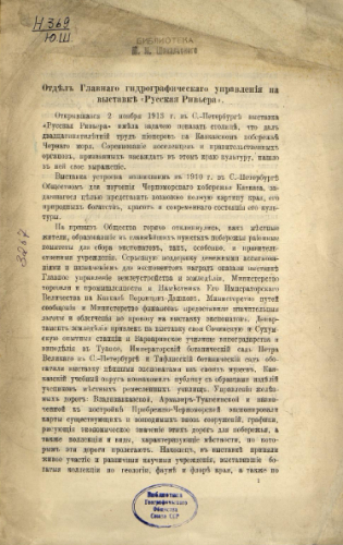 Отдел Главного гидрографического управления на выставке "Русская Ривьера". - [Санкт-Петербург] : Типография Морского министерства, в Главном Адмиралтействе, 1914. - (Отд. оттиск : Записки по Гидрографии, 1914 г. Т. 38, Вып. 1)