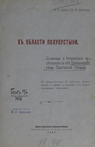 Димо, Николай Александрович. В области полупустыни [Электронный ресурс] : почв. и ботан. исслед. на юге Царицын. уезда Сарат. губ.: с прил. 20 табл. фототипий, 4 карт и пл. и 3 схематич. черт. / Н.А. Димо и Б.А. Келлер. - Электрон. текстовые дан. - Саратов : Сарат. губ. земство. Почв. лаб., 1907 (2013).