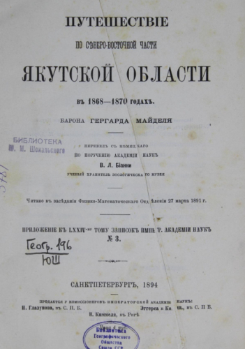 Майдель, Гергард Людвигович. Путешествие по Северо-Восточной части Якутской области в 1868-1870 годах [Электронный ресурс] : читано в заседании Физико-математического отделения 27 марта 1891 г. [Т. 1] / [соч.] барона Гергардта Майделя, 1894. - XIV, 599 с.