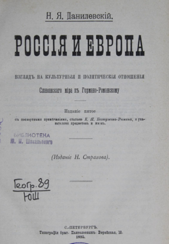 Данилевский, Николай Яковлевич. Россия и Европа [Электронный ресурс] : взгляд на культурные и политические отношения славянского мира к германо-романскому / Н.Я. Данилевский, 1895. - XLII, 629 с.