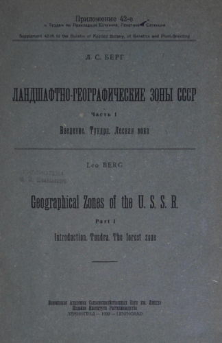 Берг, Лев Семенович. Ландшафтно-географические зоны СССР [Электронный ресурс] . Ч. 1. Введение. Тундра. Лесная зона / Л. С. Берг. - Электрон. текстовые дан. - Ленинград : Ин-т растениеводства, 1930 (2013). - 401 с. : ил., карты. - (Труды по прикладной ботанике, генетике и селекции / Всесоюз. акад. с.-х. наук им. Ленина ; прил. 42). - В электрон. версии вклеен. карты отсутствуют.