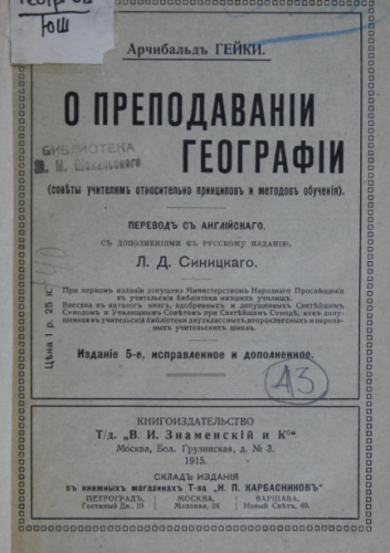 Гейки, Арчибальд. О преподавании географии [Электронный ресурс] : (Советы учителям относительно принципов и методов обучения) / А. Гейки, 1915. - VIII, 256 с.