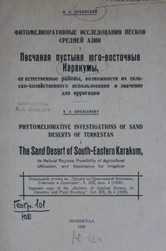Дубянский, Владимир Андреевич (1877-1962). Фитомелиоративные исследования песков Средней Азии [Электронный ресурс] . 1 : Песчаная пустыня Юго-Восточные Каракумы, ее естественные районы, возможность их сельскохозяйственного использования и значение для ирригации / В. А. Дубянский. - Ленинград, 1928 (2013). - 224 с.