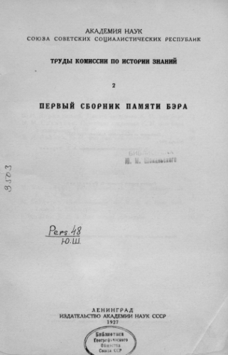 Труды Комиссии по истории знаний. [Ч.] 2 : Первый сборник памяти Бэра / Академия наук СССР ; [ред. В. Вернадский]. - Ленинград : Изд-во Акад. наук СССР, 1927