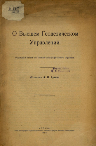 Аузан, Андрей Иванович (1871-1953). О Высшем Геодезическом управлении / А. И. Аузан. - Москва : типо-лит. Картографического отдела Корпуса военных топографов, 1920
