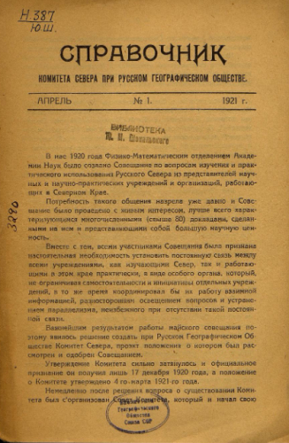Справочник Комитета Севера при Русском географическом обществе. № 1 : Апрель, 1921. - Петроград : Совет Ком. Севера, 1921