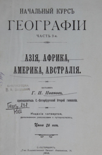 Иванов, Гермоген Иванович. Начальный курс географии [Электронный ресурс] . Ч. 2. Азия, Африка, Америка, Австралия / сост. Г.И. Иванов, преп. С.-Петербургской 2-й гимназии. - Электрон. текстовые дан. - Санкт-Петербург : На обл.: Т-во Худож. печати, 1913 (2013). - 204 с.