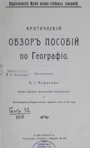 Бируков, Борис Ионович. Критический обзор пособий по географии [Электронный ресурс] / сост. Б.И. Бируков, прив.-доц. Моск. ун-та и преп. Пед. курсов воен.-учеб. вед. - Санкт-Петербург : тип. "Родник", 1909 (2013). - XVI, 269, [2] с.