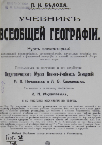 Белоха, Порфирий Никитич. Учебник всеобщей географии [Электронный ресурс] : курс элементарный, содержащий родиноведение, отечествоведение, нач. сведения из матем. и физ. географии и краткий полит. обзор земного шара / П. Н. Белоха ; перераб. А.П. Нечаевым и А.Ф. Соколовым ; карты и черт. исполнены И.Н. Михайловым. - Изд. 25-е, испр. и доп. - М. : тип. Т-ва И.Д. Сытина, 1910 (2013). - VIII, 184 с., 3 л. карт. : ил., карт., портр.
