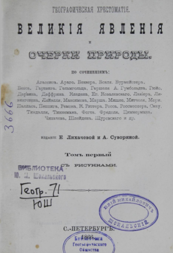 Великие явления и очерки природы [Электронный ресурс] : геогр. хрестоматия : по соч.: Агассиса, Араго, Беккера [и др.]. - Санкт-Петербург : Е. Лихачева и А. Суворина, 1866 (2013). - Т. 1. - 352 с. : ил.