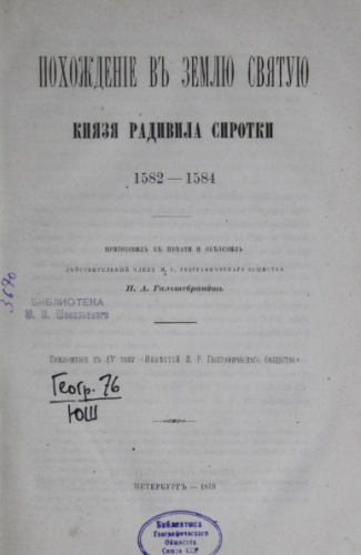 Радзивилл, Николай Христофор (1549-1616). Похождение в Землю Святую князя Радивила Сиротки, 1582-1584 [Электронный ресурс] / приготовил к печати и объяснил [и снабдил предисловием] д. чл. Р. геогр. о-ва П.А. Гильтебрандт. - Санкт-Петербург : тип. В.С. Балашева, 1879 (2013). - XII, 242 с. - Прил. к т. 15 "Изв. Р. геогр. о-ва".