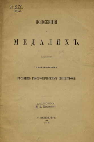 Положения о медалях, раздаваемых Императорским Русским географическим обществом. - С.-Петербург : тип. В. Безобразов и К°, 1879