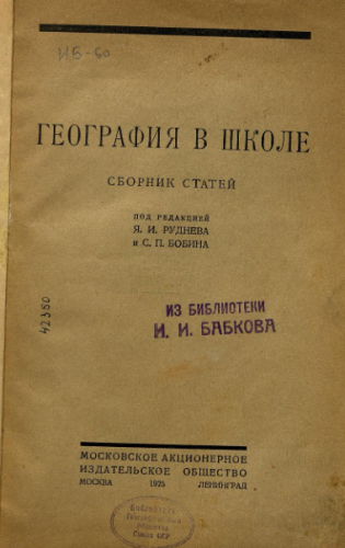 География в школе / Сб. ст. под ред. Я.И. Руднева и С.П. Бобина. - Москва ; Ленинград : Моск. акц. изд. о-во, 1925