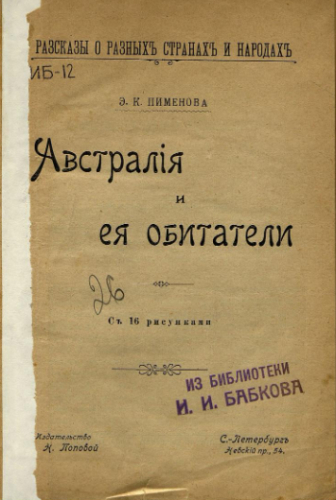 Пименова, Эмилия Кирилловна (1854-1935). Австралия и ее обитатели / Э.К. Пименова. - Санкт-Петербург : О.Н. Попова, ценз. 1903