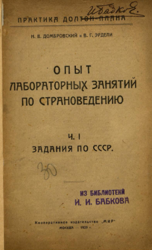 Домбровский, Николай Владимирович (1878-1949). Опыт лабораторных занятий по страноведению : (СССР. Европейские и внеевропейские государства). Ч.1 : Задания по страноведению СССР / Н.В. Домбровский и В.Г. Эрдели. - Москва : Мир, 1925