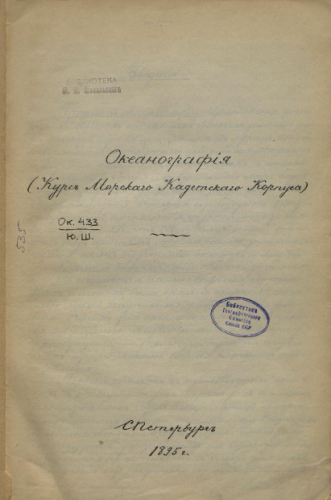 Шпиндлер, Иосиф Бернардович (1848-1919). Океанография : (Курс Морского кадетского корпуса) / И.Б. Шпиндлер. - Санкт-Петербург, 1895. - (Рукопись, литогр.)