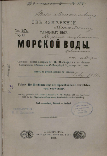 Макаров, Степан Осипович (1849-1904). Об измерении удельного веса морской воды / Сообщ. контр.-адм. С.О. Макарова в Физ.-хим. о-ве в С.-Петербурге 8/20 янв. 1891 г. - Санкт-Петербург : Тип. В. Демакова , 1891
