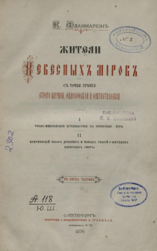 Фламмарион, Камиль (1842-1925). Жители небесных миров с точки зрения строго научной, философской и фантастической : 1. Учено-живописное путешествие в небесные миры 2. Критический обзор древних и новых теорий о жителях небесных сфер / К. Фламмарион. - Санкт-Петербург : тип. и хромолит. А. Траншеля, 1876