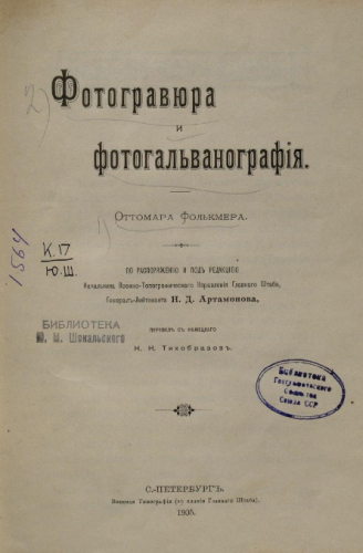Фолькмер, Оттомар (1839-1901). Фотогравюра и фотогальванография / О. Фолькмер ; по распоряжению и под ред. нач. Военно-Топографического упр. Главного штаба генерал-лейтенанта Н.Д. Артамонова ; пер. Н.Н. Тихобразов. - Санкт-Петербург : Военная типография, 1905