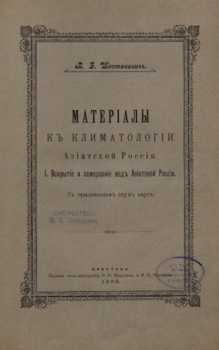 Шостакович, Владимир Болеславович (1870-1942). Материалы к климатологии Азиатской России. 1 : Вскрытие и замерзание вод Азиатской России : с приложением двух карт. / В.Б. Шостакович. - Иркутск : паровая типо-лит. П. И. Макушина и В. М. Посохина, 1909