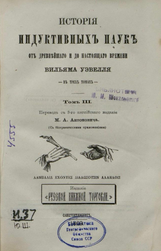 Уэвелль, Уильям (1794-1866). История индуктивных наук от древнейшего и до настоящего времени. Т. 3. / [соч.] Вильяма Уэвелля ; пер. с 3-го англ. изд. М.А. Антоновича, А.Н. Пыпина. - Санкт-Петербург : Русская книжная торговля, 1869