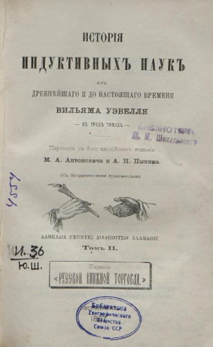 Уэвелль, Уильям (1794-1866). История индуктивных наук от древнейшего и до настоящего времени. Т. 2. / [соч.] Вильяма Уэвелля ; пер. с 3-го англ. изд. М.А. Антоновича, А.Н. Пыпина. - Санкт-Петербург : Русская книжная торговля, 1867