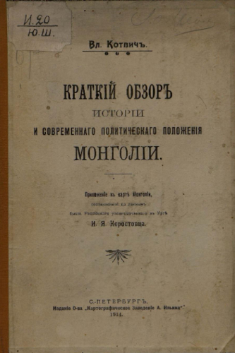 Котвич, Владислав Людвигович (1872-1944). Краткий обзор истории и современного политического положения Монголии : приложение к карте Монголии / Сост. по данным рос. уполномоченного в Урге И.Я. Коростовца. - С.-Петербург : Изд-е О-ва Картограф. завед. А. Ильина, 1914