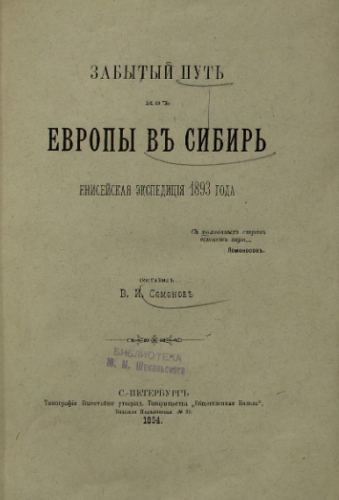 Семенов, Владимир Иванович (1867-1910). Забытый путь из Европы в Сибирь : Енисейская экспедиция 1893 года / сост. В.И. Семенов. - Санкт-Петербург : тип. Товарищества "Общественная польза", 1894