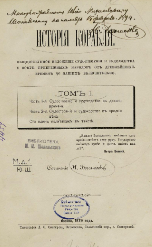 Боголюбов, Николай Петрович (1820-1898). История корабля : общедоступное изложение судостроения и судоходства у всех прибрежных народов от древнейших времен до наших включительно. Т. 1. / Н.П. Боголюбов. - Москва : тип. Л.Ф. Снегирева, 1879