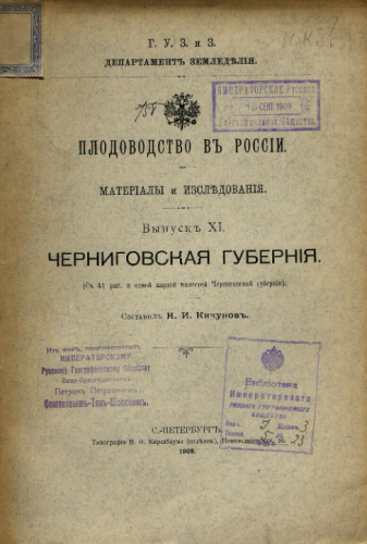 Плодоводство в России : Материалы и исследования. Вып. 11 : Черниговская губерния / Сост. Н.И. Кичунов ; Г.У.З. и З. Деп. зем. - Санкт-Петербург : Тип. В.Ф. Киршбаума, 1908