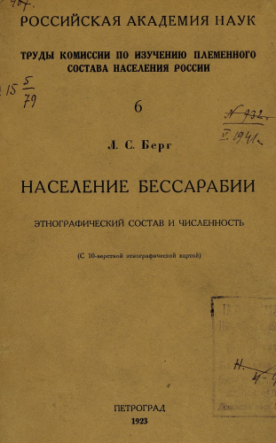 Население Бессарабии : Этногр. состав и численность / Л. С. Берг. - Петроград, 1923. (Труды Комиссии по изучению племенного состава населения России ; №6)