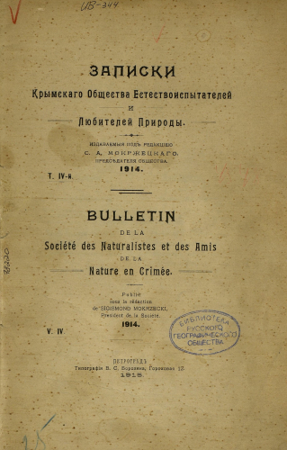 Записки Крымского Общества Естествоиспытателей и Любителей Природы. Т. 4 : 1914 / Под. ред. С. А. Мокржецкого, председателя о-ва. - Петроград : Тип. В.С. Борозина, 1915