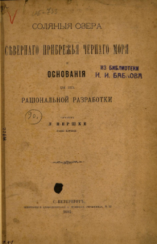 Першке, Людвиг Людвигович (1844–1926). Соляные озера северного прибрежья Черного моря и основания для их рациональной разработки / Л. Першке. - Санкт-Петербург : Тип. и хромолит. А. Траншеля, 1882