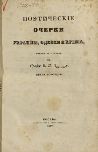 Бороздна, Иван Петрович (1804-1858). Поэтические очерки Украины, Одессы и Крыма / письма в стихах к графу В. П. З[авадскому] Ивана Бороздны. - Москва : Тип. С. Селивановского, 1837