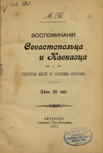 Ботьянов, Михаил Иванович (1835-1916). Воспоминания севастопольца и кавказца и некоторые мысли по военным вопросам / М.Б. - Витебск : Губ. типо-лит., 1901