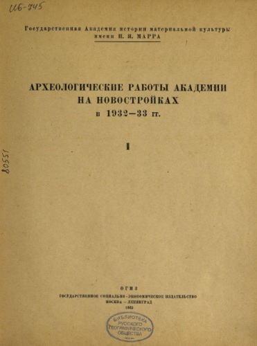 Археологические работы Академии на новостройках в 1932-33 гг. [Ч.] 1. / Гос. Акад. истор. матер. культ. им. Н.Я. Марра. - Москва ; Ленинград : ОГИЗ, Государственное социально-экономическое изд-во, 1935