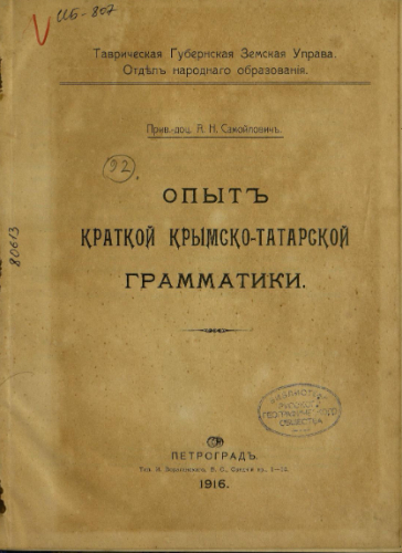 Самойлович, Александр Николаевич (1880-1938). Опыт краткой крымско-татарской грамматики / А.Н. Самойлович ; Таврическая Губ. зем. управа. Отдел народного образования. - Петроград : Тип. И. Бораганского, 1916