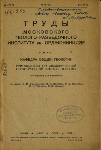 Труды Московского геолого-разведочного института им. Орджоникидзе. Т. 14 : Кафедра общей геологии. Руководство по академической геологической практике в Крыму. - Москва ; Ленинград : ГОНТА-НКТП-СССР, Глав. ред. горно-топливной и геолого-разведочной литературы, 1938