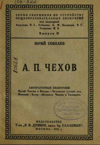 Соболев, Юрий Васильевич (1887-1940). АА.П. Чехов. Литературные экскурсии: Музей Чехова в Москве. Чеховские уголки под Москвой. Ялта. Комната Чехова в Таганроге / Юрий Соболев. - Москва : Т-во "В. В. Думнов наследники бр. Салаевых", 1924