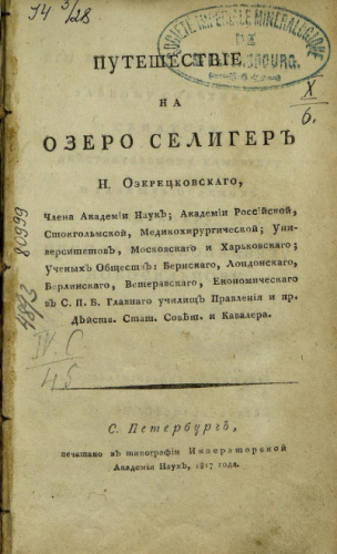 Путешествие на озеро Селигер / [соч.] Н.Озерецковского, члена Академии наук ; Академии Российской... и пр., действ. стат. совет. и кавалера. - Санкт-Петербург : Тип. Имп. Акад. наук, 1817