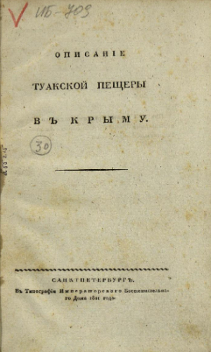 Кеппен, Петр Иванович (1793-1864). Описание Туакской пещеры в Крыму / П.И. Кеппен. - Санкт-Петербург : Тип. Имп. Воспитательного дома, 1821