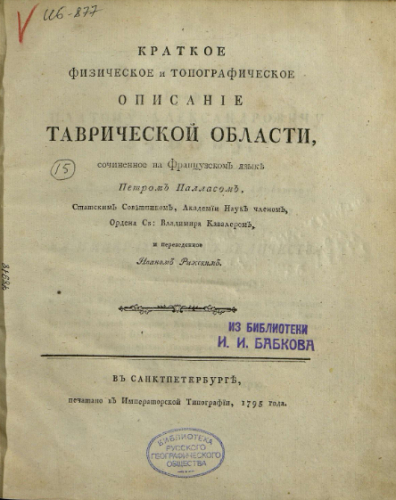 Краткое физическое и топографическое описание Таврической области : соч. на французском языке / Соч. Петром Палласом, статским сов., Акад. наук членом, Орд. Св.: Владимира Кавалером, и перев. Иваном Рижским. - Санкт-Петербург : Имп. тип., 1795