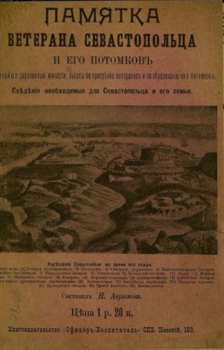 Памятка ветерана севастопольца и его потомков : Сведения необходимые для севастопольца и его семьи : Высочайше дарованные милости; льготы по призрению ветеранов и по образованию их потомков / Сост. Н. Аврамов. - Санкт-Петербург : Офицер-воспитатель, 1907