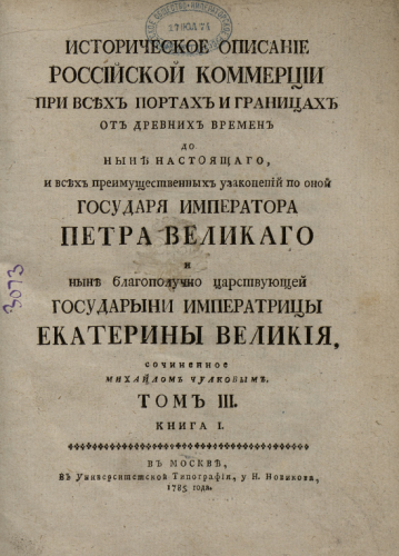 Чулков, Михаил Дмитриевич (ок. 1743-1792). Историческое описание российской коммерции при всех портах и границах от древних времен до ныне настоящего... Т. 3, Кн. 1. / соч. Михаилом Чулковым. - Москва : Универ. тип., у Н. Новикова, 1785