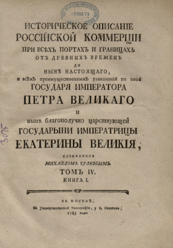 Чулков, Михаил Дмитриевич (ок. 1743-1792). Историческое описание российской коммерции при всех портах и границах от древних времен до ныне настоящего... Т. 4, Кн. 1. / соч. Михаилом Чулковым. - Москва : Универ. тип., у Н. Новикова, 1785