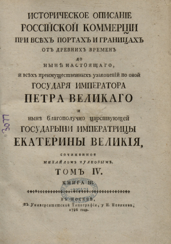 Чулков, Михаил Дмитриевич (ок. 1743-1792). Историческое описание российской коммерции при всех портах и границах от древних времен до ныне настоящего... Т. 4, Кн. 3. / соч. Михаилом Чулковым. - Москва : Универ. тип., у Н. Новикова, 1786