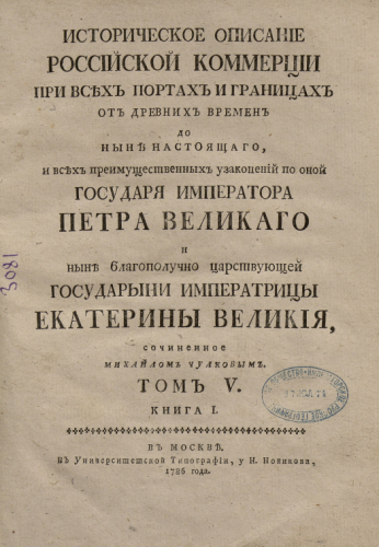 Чулков, Михаил Дмитриевич (ок. 1743-1792). Историческое описание российской коммерции при всех портах и границах от древних времен до ныне настоящего... Т. 5, Кн. 1. / соч. Михаилом Чулковым. - Москва : Универ. тип., у Н. Новикова, 1786