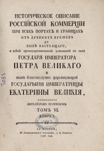Чулков, Михаил Дмитриевич (ок. 1743-1792). Историческое описание российской коммерции при всех портах и границах от древних времен до ныне настоящего... Т. 6, Кн. 1. / соч. Михаилом Чулковым. - Москва : Универ. тип., у Н. Новикова, 1786