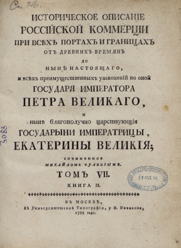 Чулков, Михаил Дмитриевич (ок. 1743-1792). Историческое описание российской коммерции при всех портах и границах от древних времен до ныне настоящего... Т. 7, Кн. 2. / соч. Михаилом Чулковым. - Москва : Универ. тип., у Н. Новикова, 1788